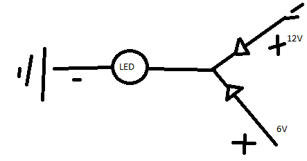 Hello this is my first post here and I am not very good at electric circuits, so I'm not familiar with the jargon either, I'll describe the practical use of the circuit I'm trying to make, basically I have a LED underneath the pedals in my car which will be permanently connected to something around 6 volts which will make a faint light but when I turn the overhead dome light I want the LED under the pedals to receive the full 12 volts to have maximum intensity. I have made a small scheme which may explain the problem better, thank you and I hope you understood my problem despite my difficult description. My question is: Will this work?