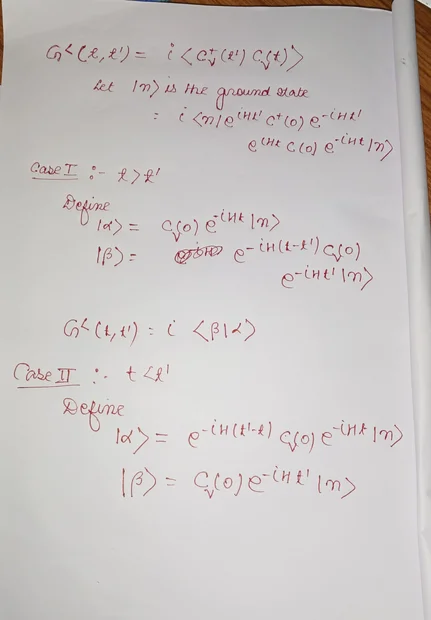 $$G^{<}(t,t')=i\langle C_{\nu}^{\dagger}(t')C_{\nu}(t)\rangle=i\bra{n}C_{\nu}^{\dagger}(t')C_{\nu}(t)\ket{n}$$ where ##\ket{n}## is the many particle ground state.