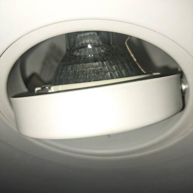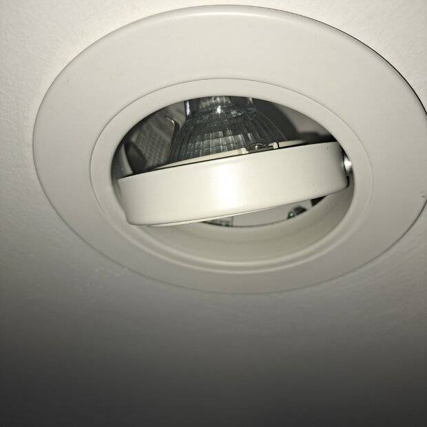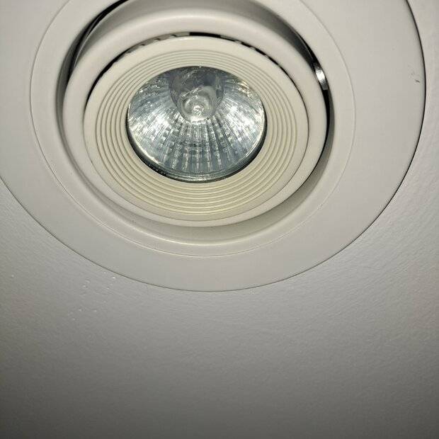 There's a recessed light on a hinge (a gimbal light maybe?) There are three exterior white rings - the outermost is a trim, the middle is a flat piece, the inner is ridged. Both the middle and inner piece move on the swivel, and the middle piece is attached to the pivots on the side that let you angle the light.