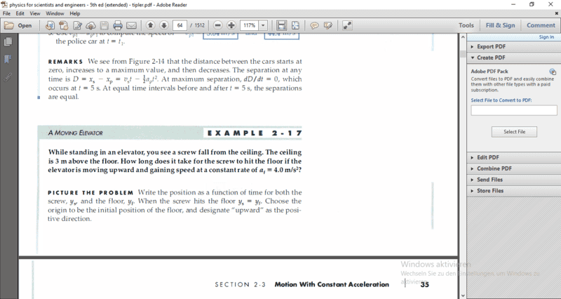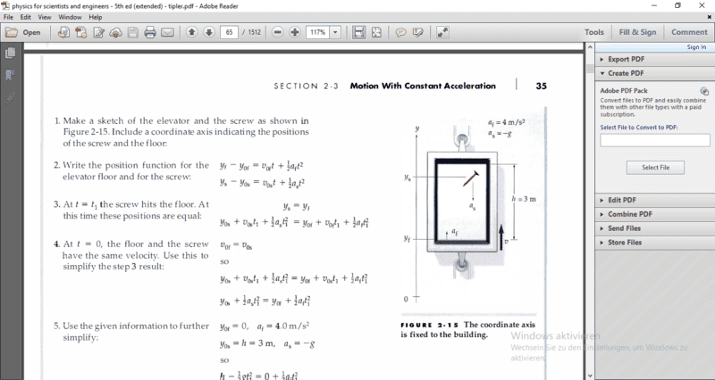 The discussion revolves around a physics problem involving an elevator and a screw, specifically focusing on their relative motions when the screw separates from the ceiling of the elevator. The problem includes parameters such as the elevator's upward velocity and the height of the elevator.
