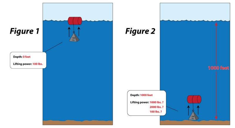 Then, you took the same barrel and you put it at the bottom of the ocean 1000 feet down (see Figure 2) would the pressure down there give the barrel more lifting power? Would that same barrel be able to lift 1000 lbs. down there? 2000 lbs.?