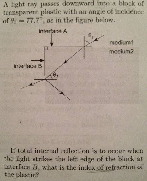If total internal reflection is to occur when the light strikes the left edge of the block at interface B, what is the index of refraction of the plastic?