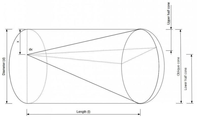 I now need to calculate the solid angle due to this oblique cone which I cannot seem to do. So since it is given that the length of the cylinder is much longer compared to the radius of its base, I thought I could brake the oblique cone into 2 half right cones and add up the solid angles due to them. I'm not sure if this is correct.