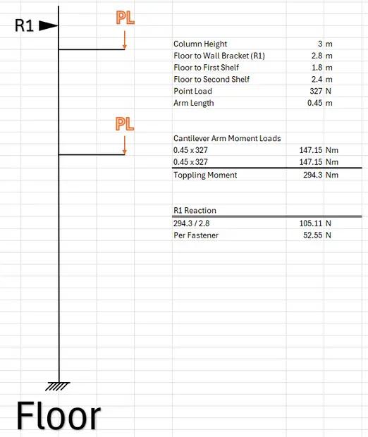 Below is the diagram for the shelving uprights. There are 3 uprights in total with shelving boards linking the three. The most I would plan to put up there is 100kg per shelf and assuming a pointload at the tip worst case. (Hence 327N per arm)