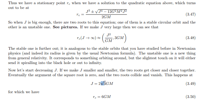 So I believe it says' ##J## big enough it had 2 solutions' is basically saying just avoiding the imaginary solutions i.e. ## J^4 \geq 12G^2M^2J^2 ## (equality for one route obvs).