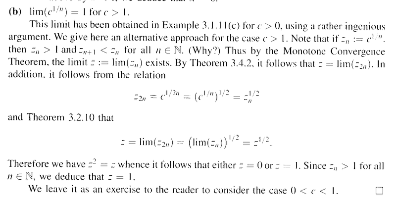 " ... ... Note that if ##z_n := c^{ \frac{1}{n} }## then ##z_n \gt 1## and ##z_{ n+1 } \lt z_n## for all ##n \in \mathbb{N}##. (Why?) ... "Can someone help me to show rigorously that ##z_n \gt 1## and ##z_{ n+1 } \lt z_n## for all ##n \in \mathbb{N}## ... ... ?Hope that someone can help ...