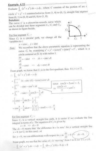 The discussion centers on the differentiation of the line integral of a scalar field along piecewise curves, specifically segments c2 and c3. For segment c2, the author differentiates dx with respect to dy, resulting in dx = 0, as y is the only variable along the path. In contrast, for segment c3, the differentiation is performed on the function f=y with respect to x, leading to dy/dx = 0. The slopes of both segments are zero due to the nature of the paths defined by the functions.