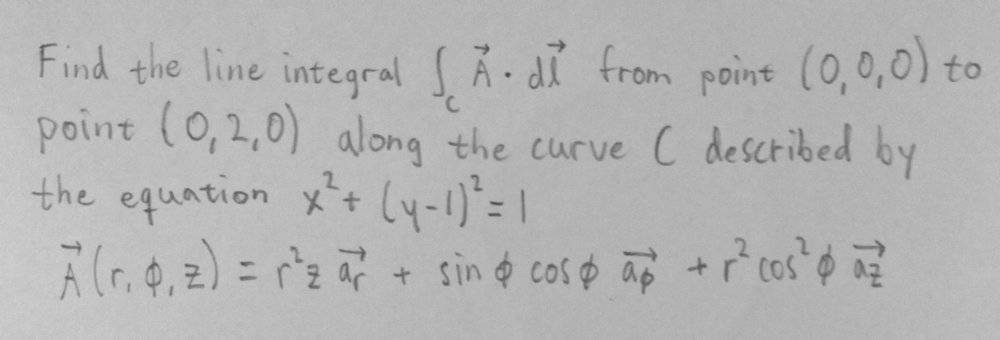 The integral can be rewritten as integral A dot l(t) dt, with the limits as 0 and pi.Now everything would be fine if the vector field A was given in cartesian coordinates but its not. You could transform different coordinate systems but I can't figure it out. Could someone please show me how to start on the last steps?
