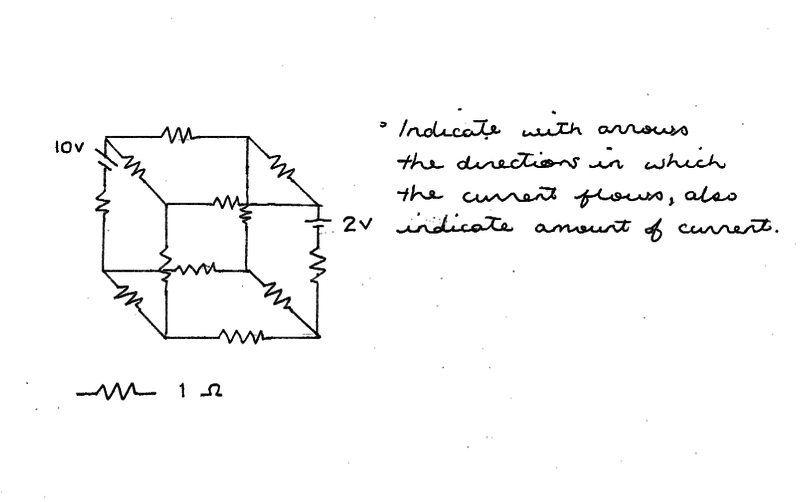 The questions is to find the currents that are going through EACH resistor, and the DIRECTION that they are going in. There should be a total of 12 arrows indicating the directions of the currents, 1 on each side.