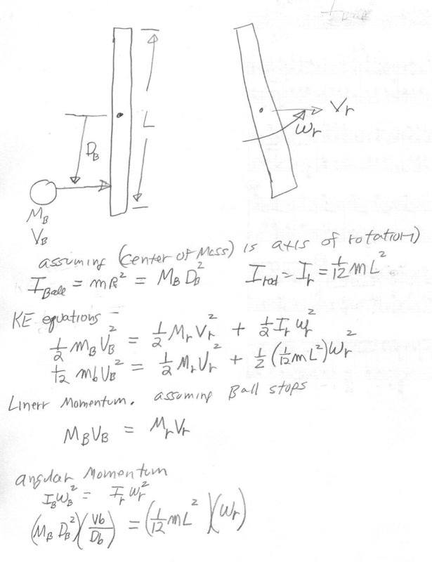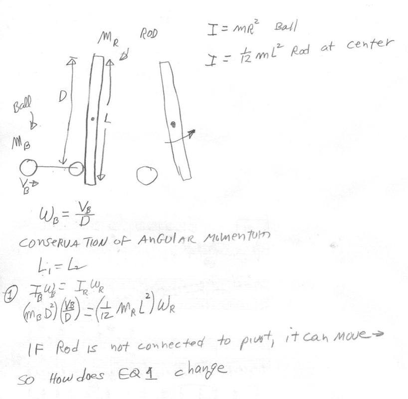 - Ball of mass mb and velocity vb hits rod of length L , Rod pivots about the center. What is the angular momentum aafter impact?