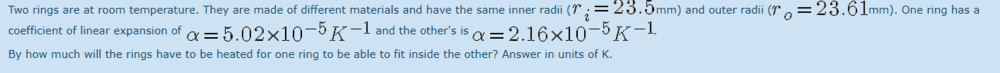 So if I am understanding the question correctly, I need to find the change in temperature that causes one rights outer radii to be the same as another rings inner radii.