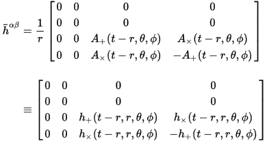 $$ h_{ab} \propto \frac{1}{r} \, \frac{\partial^2}{ \partial t^2 } D_{ab}$$