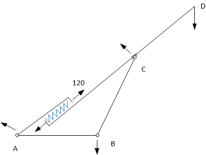 I am working on this linkage mechanism. Please see the attachment for images. There are 3 pivot points. Two of which are connected to the ground. The" Inside Leg 1" is telescopic to "Leg 2" and has a 120 LB compression gas spring connected at mount points as shown in the image. The leg 3 is geometrically placed to have the correct opening angle(of Leg 2 which is 40 Degrees). At the open position as shown in the image the gas spring is fully extended and the system stands stable. I was looking to do a force analysis of this linkage system and study the amount of force needed to pull the leg 2 down( i.e closed position for the mechanism). Please see the attached the document for details.