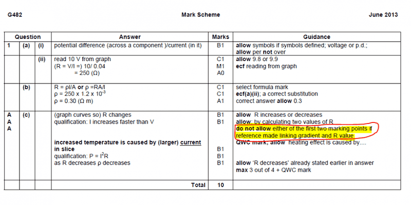 However, on a markscheme for an AS level physics paper, they penalised linking gradient to resistance in any way whatsoever. Why is that?