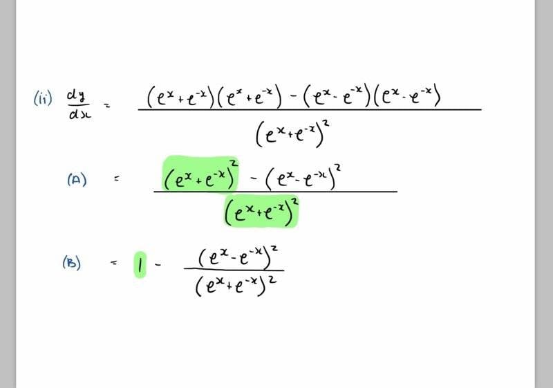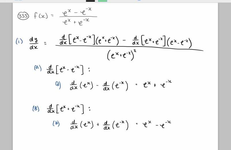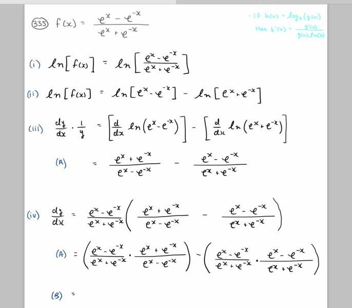 The discussion revolves around finding the derivative of the function ##f(x)=\frac{e^x-e^{-x}}{e^x+e^{-x}}##, with a focus on the techniques of differentiation, particularly logarithmic differentiation and the use of hyperbolic functions.