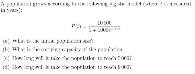 I got all the parts correct for this one, but I'm not sure how to get the carrying capacity of the function. I figured it to be 10,000, as that was what the numerator was. However, I'm sure that's not how it's meant to work. Despite the fact that I got the right answer, I'm not satisfied with the answer I gave.