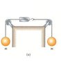There are two equal masses on each side of the table supporting by its' pulleys. Each mass is attached to each end of the spring scale.