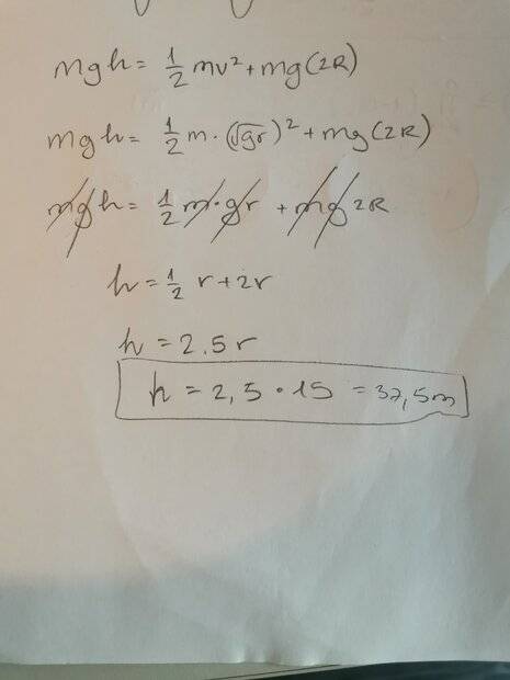 b) Normal operation of the loop takes place without a safety rail system. In this case, how high does the ramp have to be so that the skier can get through the loop without falling off? Here I thought that the force of gravity must be equal to the centripetal force. So I got that h is 7.5, that means half of the r.
