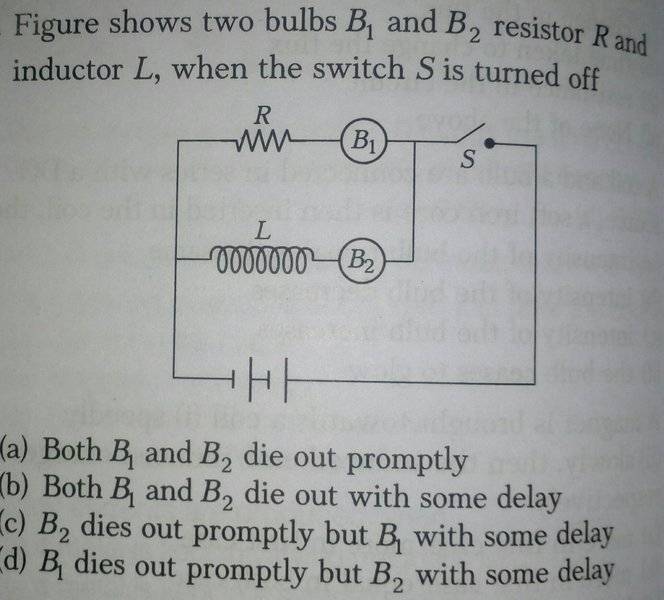 The discussion revolves around an LR circuit involving two bulbs and an inductor, specifically focusing on the behavior of the bulbs when the switch is turned off. Participants are exploring the implications of inductance on the current flow and the brightness of the bulbs during the transition.