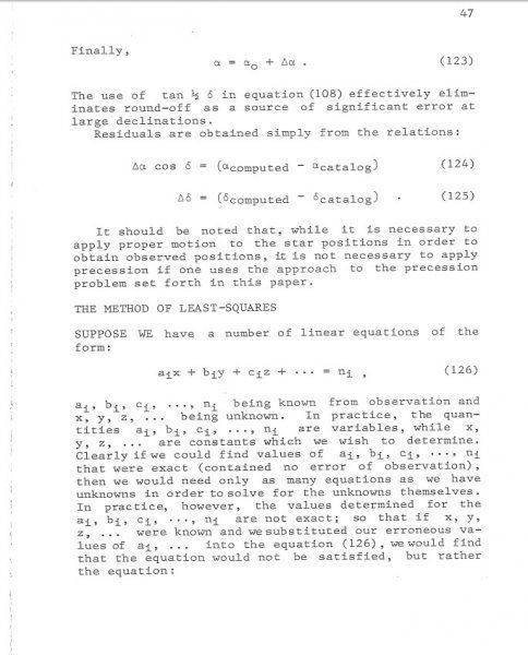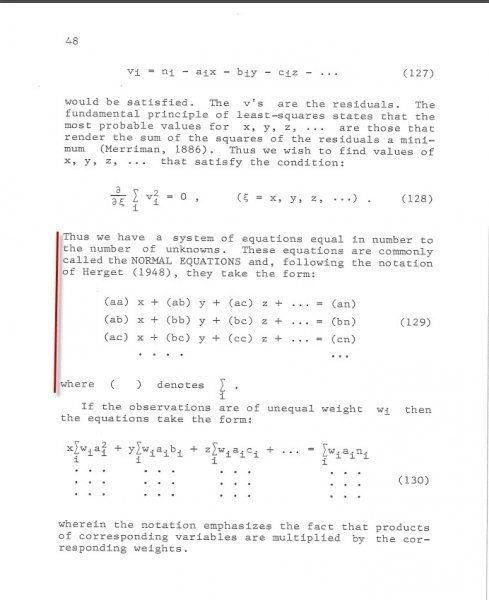 See the two pages I've attached. 47 and 48. I'm trying to understand the notation used for the (129) equations. A hint is just below the equations. ( ) ∑. These pages are describing the LSQ method. (aa), etc. aa doesn't make sense to me. Herget devised this notation in 1948.