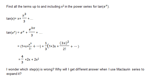 The discussion focuses on expanding the function tan(ex) using Maclaurin's Series up to the x² term. Participants emphasize the importance of including all relevant terms that contribute to the coefficient of x² in the series. The consensus is that directly applying Maclaurin's Series to tan(ex) is the most effective approach to ensure accuracy in the expansion. The conversation highlights the necessity of careful term consideration to avoid discrepancies in results.