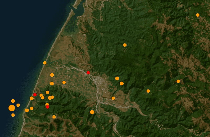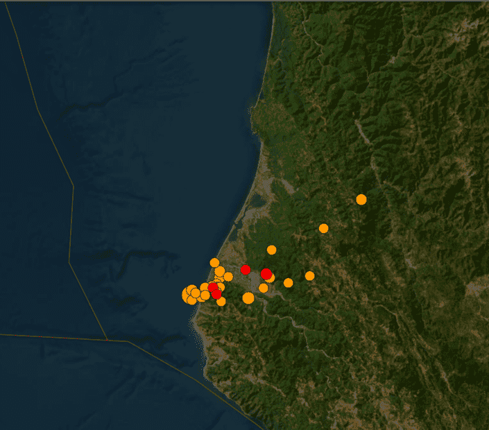 Numerous aftershocks (Mag 2-4) occurring inland. Power outages reported in Humboldt county.