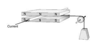 A bar of length 20cm and negligible mass can slide over two conducting rails connected to a dc generator producing an emf V0 = 6V, connected so as to produce a current as in the figure. The resistance of the bar is R = 0.08Ω, all other parts have negligible resistance. The bar is connected through a pully to a body of mass 1.2kg the system is immersed in a uniform magnetic field orthogonal to the rails, as in the figure, whose magnitude is 1T. The system is designed in such a way that, after a while, the body is pulled upward with a constant limiting speed.