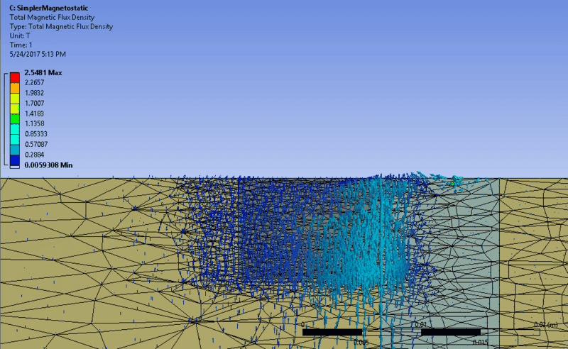 I made the mistake of using the wrong scale and going a little to detailed with this model, as you'll notice the rail is hollow (this is a way of getting around using a transient solution because in a railgun the current pulse is so fast, it operates like AC current and only travels in the skin of the rail...I'll deal with that in the rest of my analysis later). The reigon of square mesh next to the rail (copper) is the armature (aluminum), and the surrounding area is just air. I have run another version, but the simulation license is now being used by someone else, so I don't have that result to post. If I recall correctly, that result gave even smaller values. As you can see, the magnetic field in the armature is 0.017 to 0.19 T. Sure, this seems to be at least on the same order of magnitude, but, as shown by the second result image, most of the armature is near the low end of this. Yes, the other simulation has smaller values, but not something near what the MATLAB code is getting now (though I'd have trouble trusting that anyway since I believe the simple approximations the most). Would the result be significantly smaller because the Biot-Savart solutions don't consider the magnetic field needing to penetrate another metal?