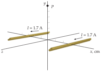 A long, straight wire carries a current of 1.7 A in the +z direction and lies along the line x = –3.0 cm, y = 0. A second such wire carries a current of 1.7 A in the +z direction and lies along the line x = +3.0 cm, y = 0, as shown in Figure. Find the magnetic field at a point P on the y-axis at y = 6.0 cm.