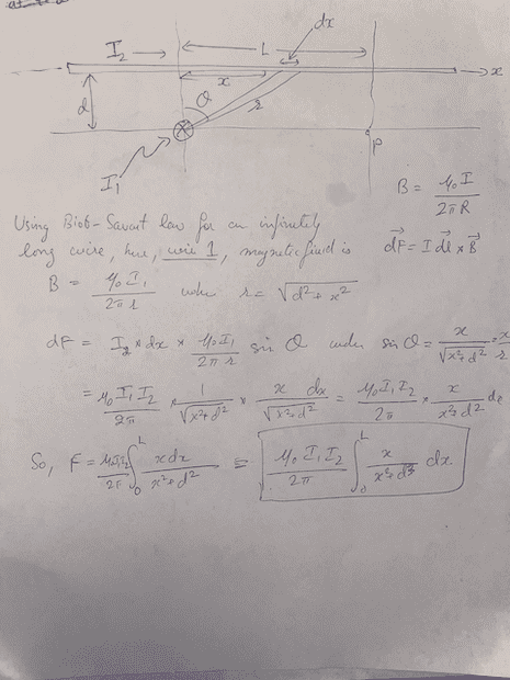 - Two wires, 1 and 2, are carrying currents I1 and I2. They are perpendicular to each other and separated by distance d.