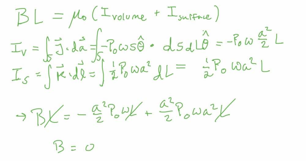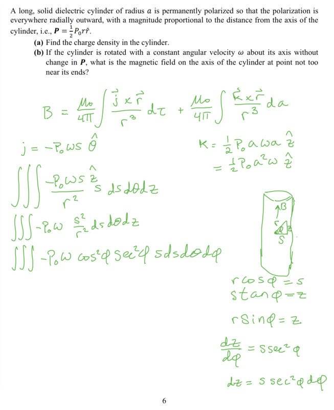 I am struggling to get my work to match the posted solutions to this problem. I understand part (a) but can’t get the integral to work out for (b). I know I have to use Biot-Savart and add up the components from the the surface and volume currents. The cylinder is very long, so I need to make a change of variables to convert the integral over z into a integral over an angle from -pi/2 to pi/2. I should end up with a term that looks like cos(angle)d(angle) in place of dz. But instead I get