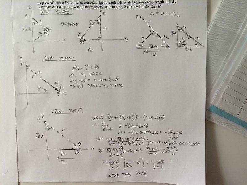 A piece of wire is bent into an isosceles right triangle whose shorter sides have length a The wire carries current I. Calculate the magnetic field for point P. Point P is located on the Y-axis ( 0, √2a). Two corners of the triangle are are located at (0,0), (√2a,0).