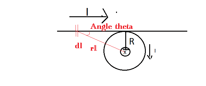 I can't relate dl with r (the distance from dl to the center) nor the angle, which I must do to compute the integral.