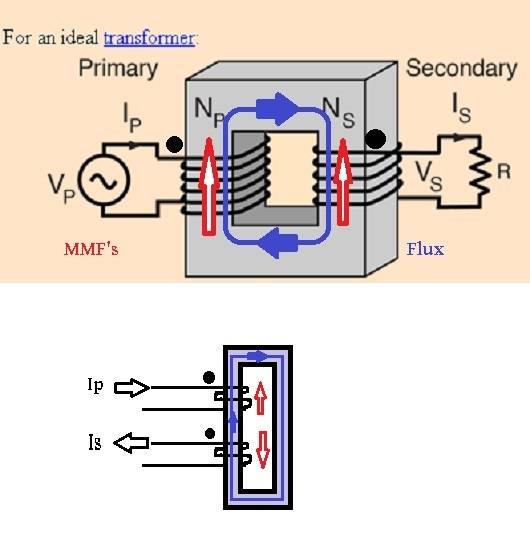 Observe current ENTERS primary's dotted terminal but LEAVES secondary's dotted terminal. By right hand rule that gives upward MMF's in both windings .