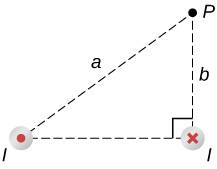 A circuit with current I has two long parallel wire sections that carry current in opposite directions. Find magneticfieldatapointPnearthesewiresthatisadistance a from one wire and b from the other wire as shown in the figure.