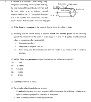 The discussion revolves around a problem involving magnetic pressure on a hollow conducting cylinder carrying a current in the presence of an external magnetic field. The participants explore the implications of the magnetic field's direction relative to the current flow and the resulting forces on the cylinder.
