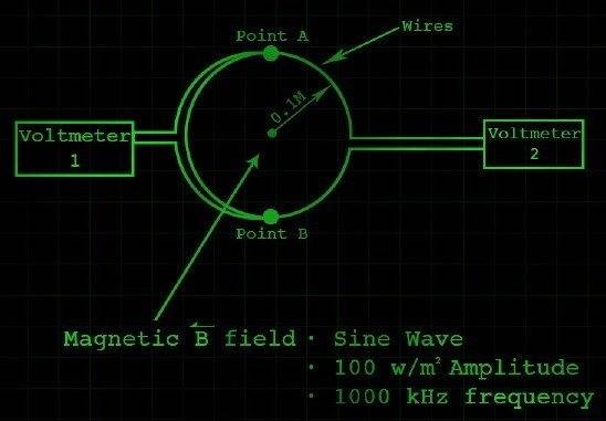 Unfortunately, I am not sure whether this configuration counts as a electromagnetic coil, or whether it is simply two single-wire circuits, one for each voltmeter, connected at Points A and B. It also isn't clear from the diagram whether voltmeter #1, and its associated circuit, is in the same plane as the other voltmeter.
