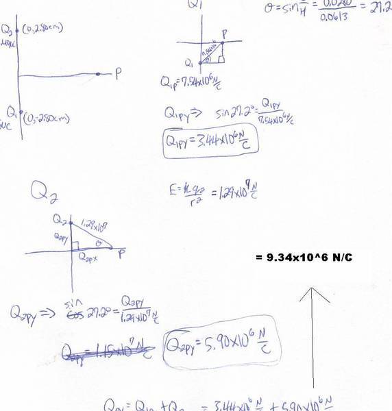 Two charges, Q1 = 3.15 μC and Q2 = 5.40 μC, are located at points (0, -2.80 cm) and (0, +2.80 cm), What is the magnitude of the electric field at point P, located at (5.45 cm, 0), due to Q1 alone?