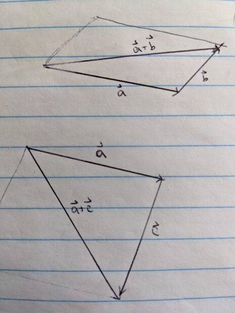 I drew these diagrams to scale, so vector a is the same in each case and the lengths of a+b and a+c are in fact equal (both 5 cm). It's clear to me that b and c are different lengths/magnitudes here. I'm not sure if the text made an error (not unheard of) or if I made an incorrect assumption somewhere. Thanks!
