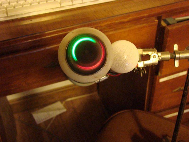 I made a magnetic field detector. I used a small U shaped magnet transformer core and wound a coil on the bottom length. This was then mounted on a piece of one inch PVC plastic pipe. One red LED and one green led were then attached to the core. A opamp was used to amplify the signal from the core and drive the LEDs. Two 9 volt batteries were mounted in the pipe and the pipe was mounted in a 2 inch piece of PVC so it could be rotated with a electric motor.