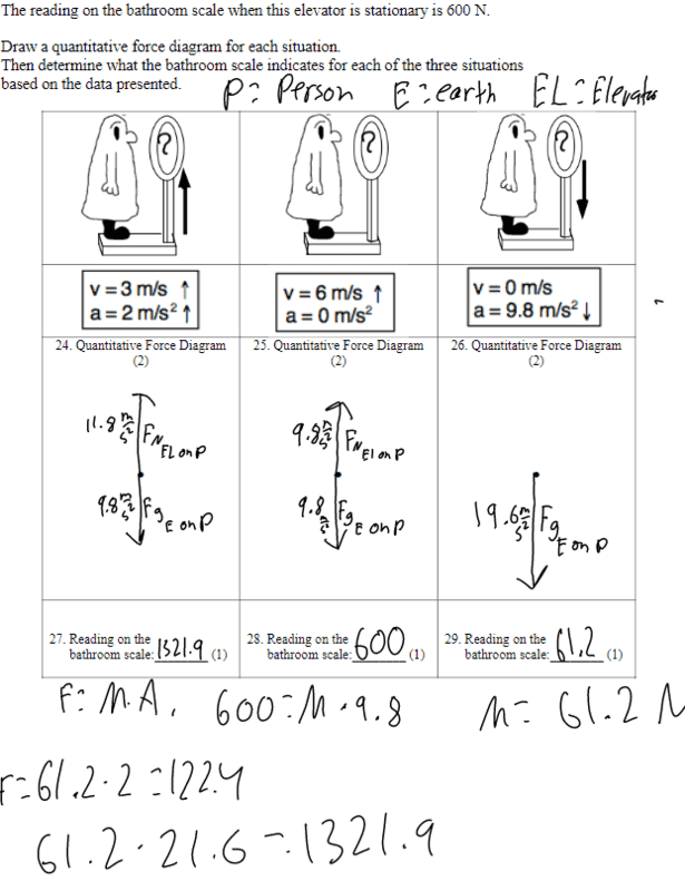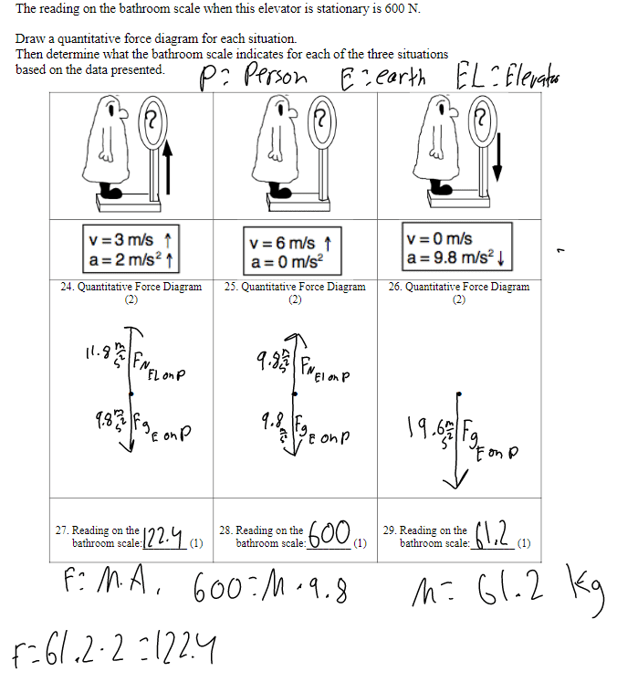 - This person is riding on an elevator in a tall building. The reading on the bathroom scale when this elevator is stationary is 600 N. Draw a quantitative force diagram for each situation.