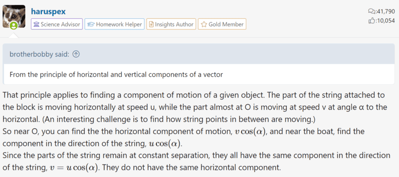 Isn't that counter-intuitive? I would imagine that the steeper the rope got (increasing ##\alpha##), the slower the boat should move horizontally along the water surface, not faster.