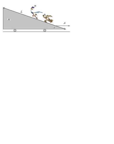 A man, whose mass is m, is running up a block of mass M (as shown in the diagram, please see attachment) with constant acceleration. The block is laid on a smooth ground. The man starts running from rest and the time it takes for him to traverse a distance L (across the block) is T.