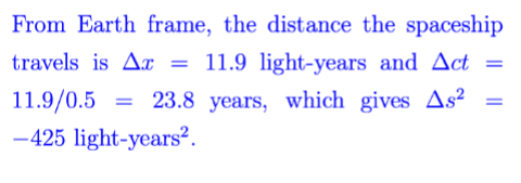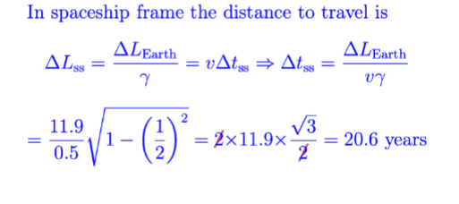 However, I'm confused by this calculation for (b). I get ##\Delta x = 11.9~c~years## and ##\Delta ct = \frac{c\Delta x}{v} = \frac{11.9 c^2 years}{0.5 c} = \frac{11.9~c~years}{0.5}##