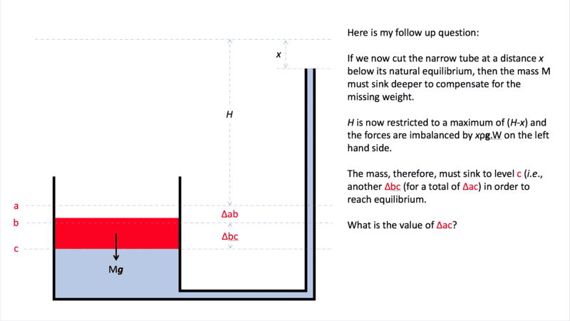 - There is a discussion about the dependency of H on the width of the right-hand tube (w) and the implications of pressure variation in the vertical direction.