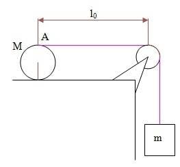 A cylinder of mass M and radius r is at distance l0 from the edge. mass m is hanging from a rope. no friction at the weightless pulley. the cylinder starts rotating without sliding.