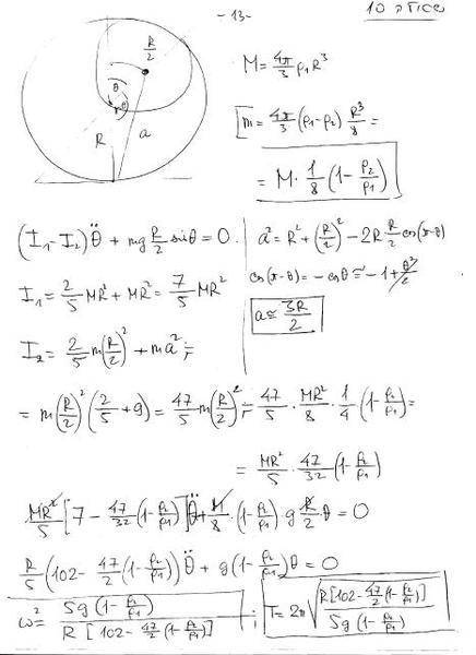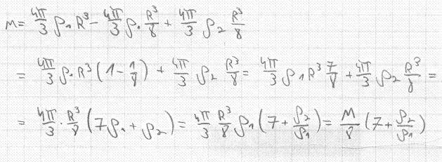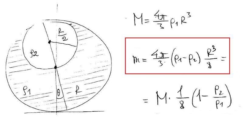 Look at this one, I have a ball with density p1 and radius R. Inside the ball they dig another ball with radius R/2 and fill it up with material that has density p2. My question is, why does the mass "m" equals to what they wrote in the answer (marked with red)? why do I need to subtract the densitys in order to find the new mass?