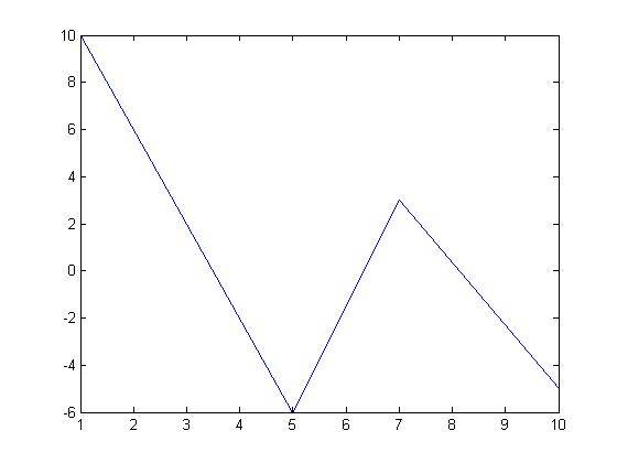 y = [10 2 -6 3 -5]; x=[1 3 5 7 10];