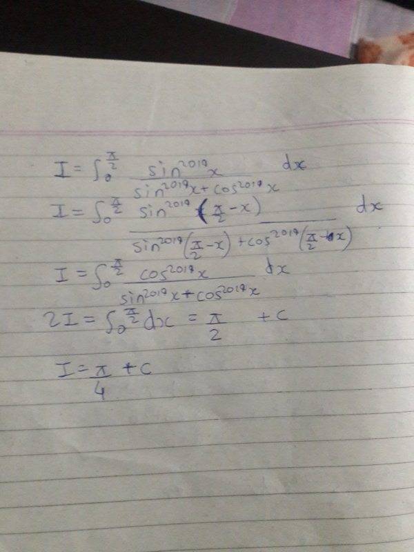 I agree but for the constant C which is not needed since we have here the definite integral ##\int_0^{\pi /2} \, dx = \pi /2##.