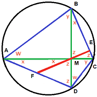 $$13. (solved by @etotheipi ) Let ##A, B, C## and ##D## be four points on a circle such that the lines ##AC## and ##BD## are perpendicular. Denote the intersection of ##AC## and ##BD## by ##M##. Drop the perpendicular from ##M## to the line ##BC##, calling the intersection ##E##. Let ##F## be the intersection of the line ##EM## and the edge ##AD##. Then ##F## is the midpoint of ##AD##.